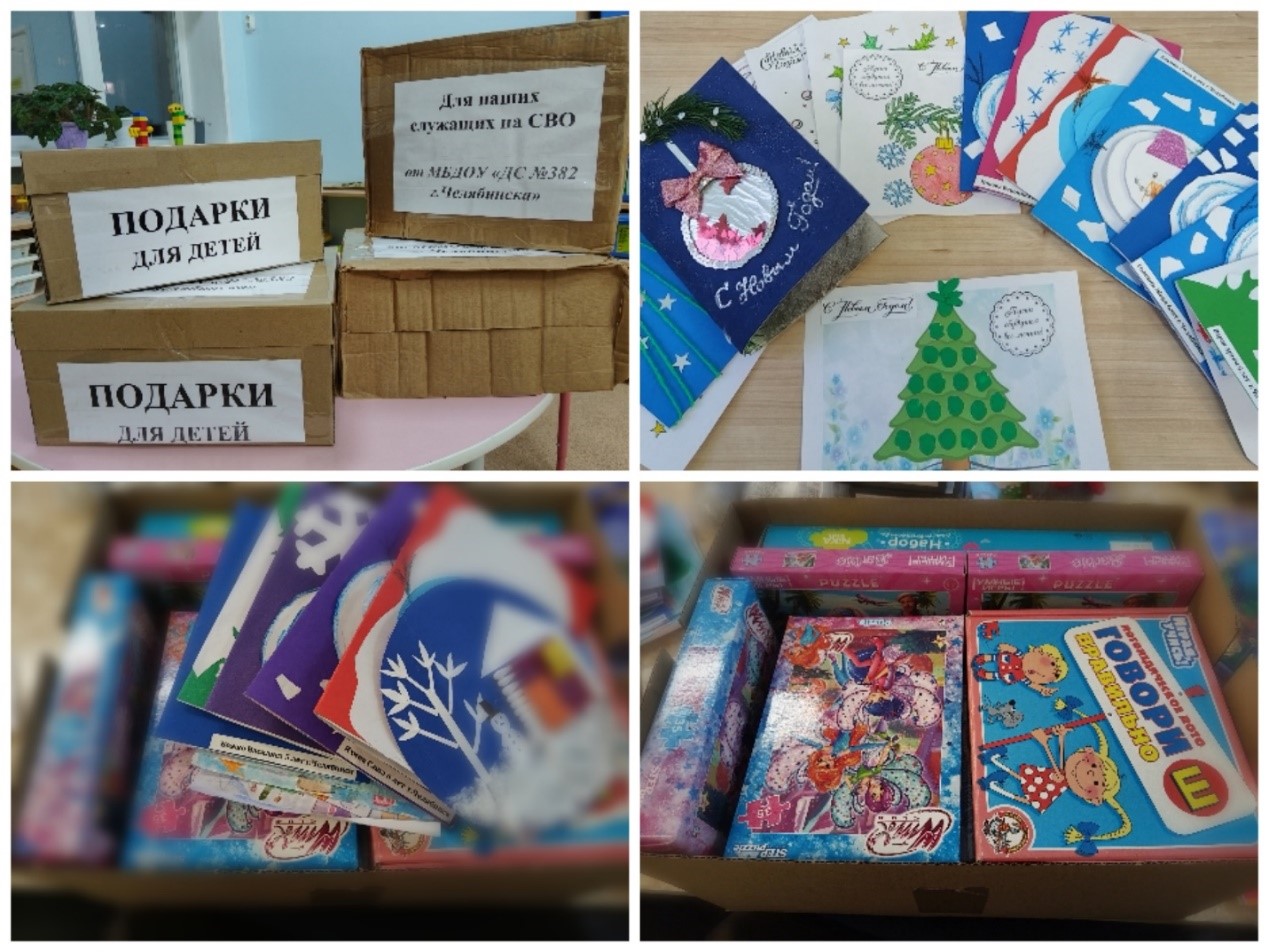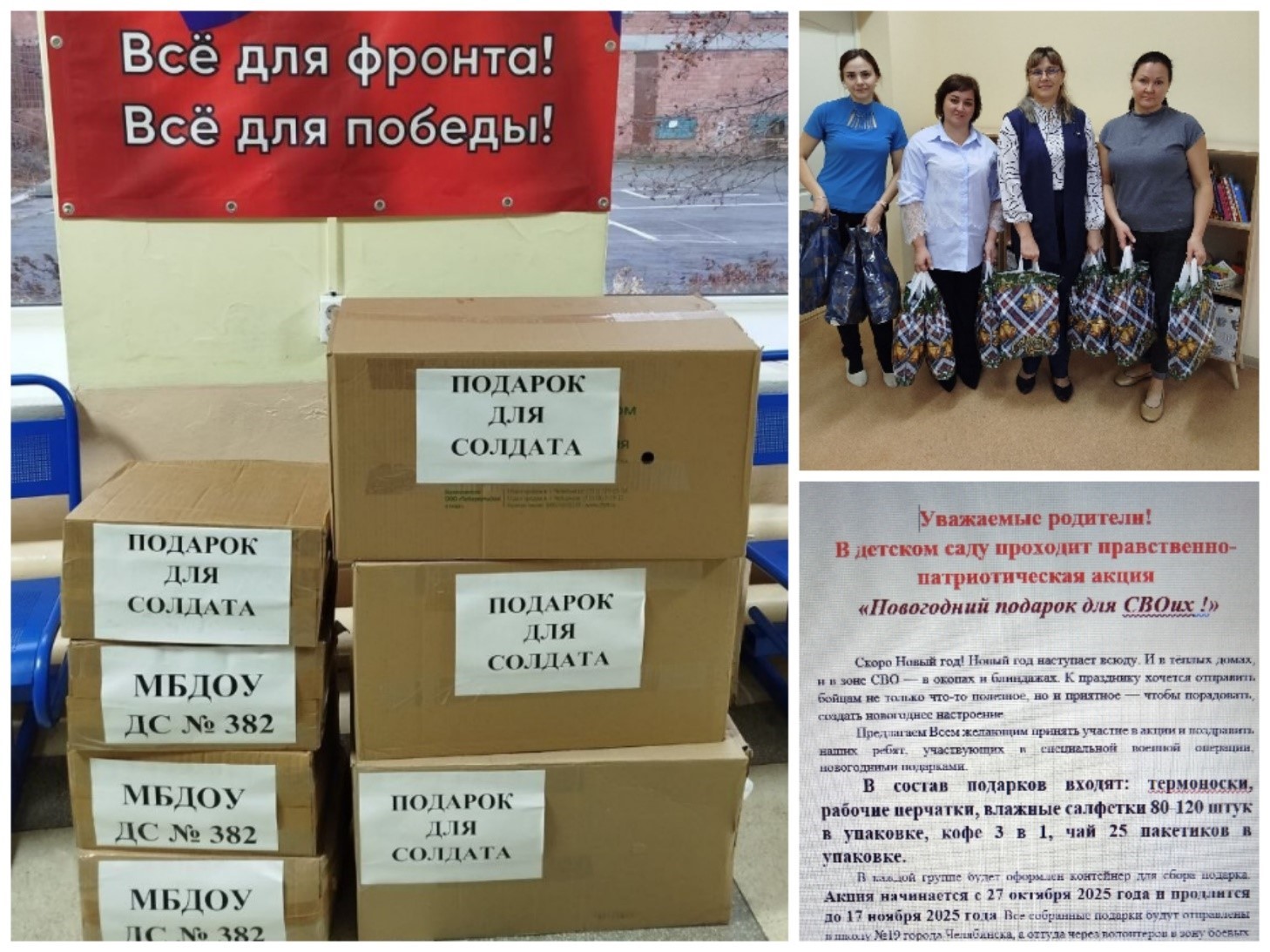 В детском саду в период с 27 октября по 17 ноября 2025 была организована социально-патриотическая акция ««Новогодний подарок для СВОих !», приуроченная к Всемирному дню доброты. Сотрудникам и родителям к Новогоднему празднику захотелось отправить бойцам не только что-то полезное, но и приятное, чтобы порадовать и создать предновогоднее настроение нашим ребятам. Так и была организована и отправлена гуманитарная помощь участникам СВО в виде индивидуальных новогодних подарков. Все собранные подарки были отправлены в школу №19 города Челябинска, а оттуда через волонтеров в зону боевых действий!