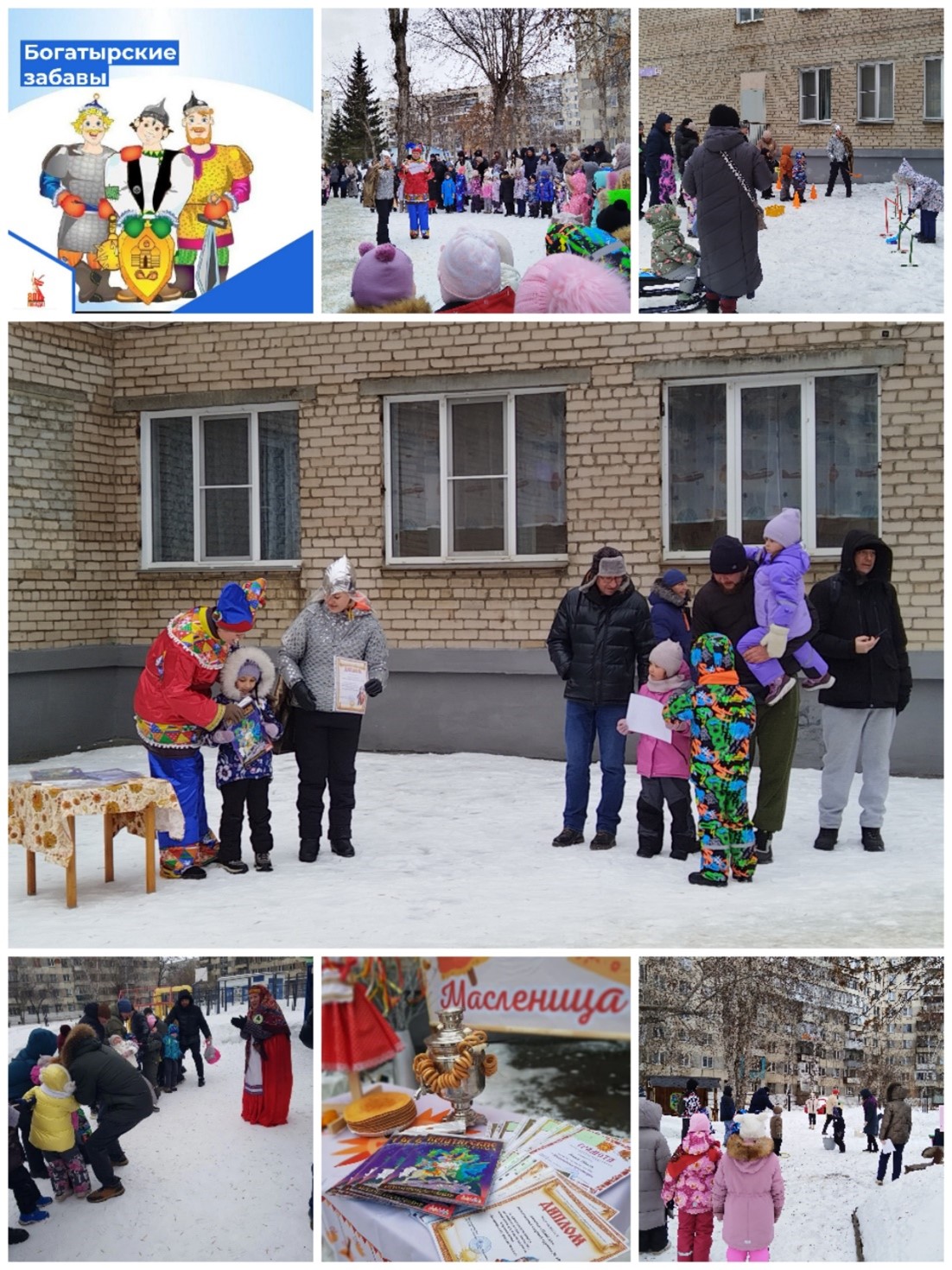 В Масленичную неделю, 20 февраля на территории нашего детского сада прошли,, Богатырские забавы,,. Мы устроили настоящий спортивный праздник для ребят старших групп в честь праздника,, День Защитника Отечества,,! Главными гостями стали не только папы, но и мамы. Главными ведущими праздника были Скоморох и Богатырь Илья Муромец, вместе с ними все отправились проходить спортивные состязания на Богатырские заставы. Соревнования были направлены на ловкость, силу, быстроту, меткость. Все старшие группы с большим азартом прошли спортивные эстафеты и были посвящены в Богатыри, и награждены Грамотами и ценными подарками. Ну и на этом всеобщее веселье не закончилось, так как после веселых состязаний состоялась Масленичная ярмарка для всего детского сада!!