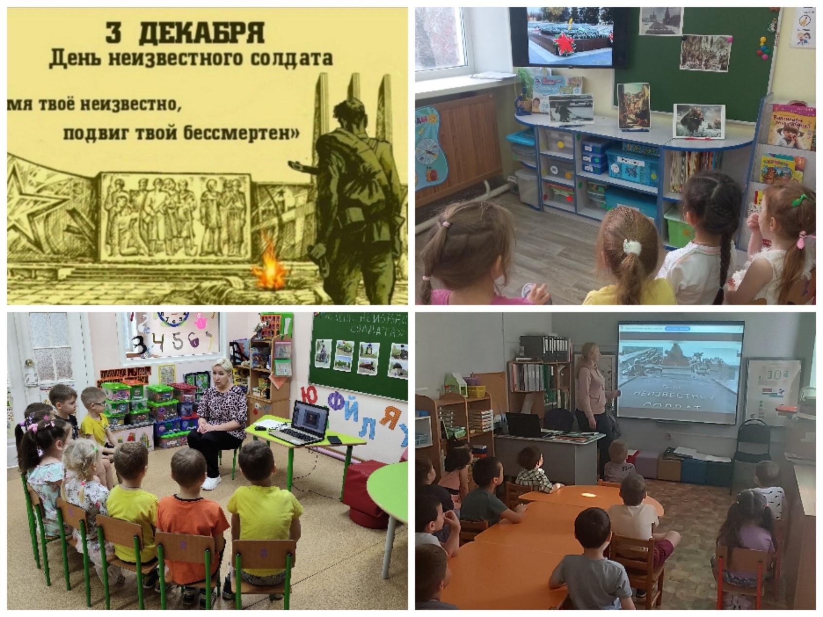3 декабря в нашем детском саду для детей подготовительных к школе групп было организовано воспитательное мероприятие «День Неизвестного Солдата». В годы Великой Отечественной войны много погибло солдат, их находили часто без документов. Никто не знал, как их зовут, откуда они родом, кто их родственники. Таких воинов хоронили прямо на полях боя, а на табличке подписывали «Неизвестный солдат, павший смертью храбрых».Чтобы сохранить народную память о них, во многих городах, где велись ожесточенные бои, есть могилы Неизвестного солдата, мемориалы и памятники. Ребята в беседе с воспитателями узнали, какие памятники, посвящённые героям войны — известным и неизвестным — есть в нашем городе и Тракторозаводском районе.