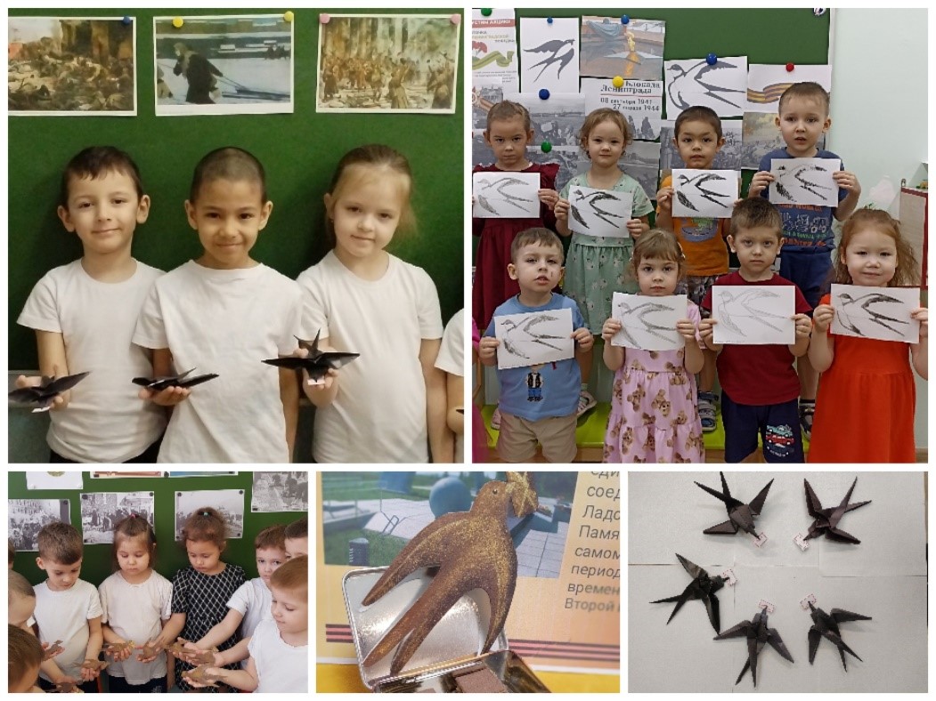 Блокада-это не только голод, холод, смерть, но это еще и огромная вера людей в Победу и желание жить! Весной 1942 года немецкое командование заявило «Отныне даже птица не сможет пролететь через кольцо блокады!». Но Ленинградцы продолжили верить в Победу и именно так появилась Блокадная ласточка с письмом в клюве. Наш детский сад не смог остаться в стороне в честь исторической памятной даты и принял участие в патриотических акциях дошкольного учреждения «Блокадная Ласточка» и «Ленточка Ленинградской Победы». Ленточка повторяет цвета муаровой ленты медали «За оборону Ленинграда» и состоит из полос ткани двух цветов: оливкового, символизирующего Победу и зеленого-цвет жизни. Наши ребята вместе с педагогами смастерили значки и Победные ленточки и почтили память погибших минутой молчания.